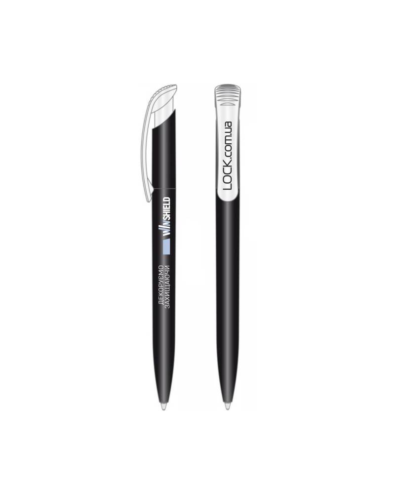 Канцелярська ручка брендована. Пластик. Колір корпусу чорний з білим. Чорнила сині.