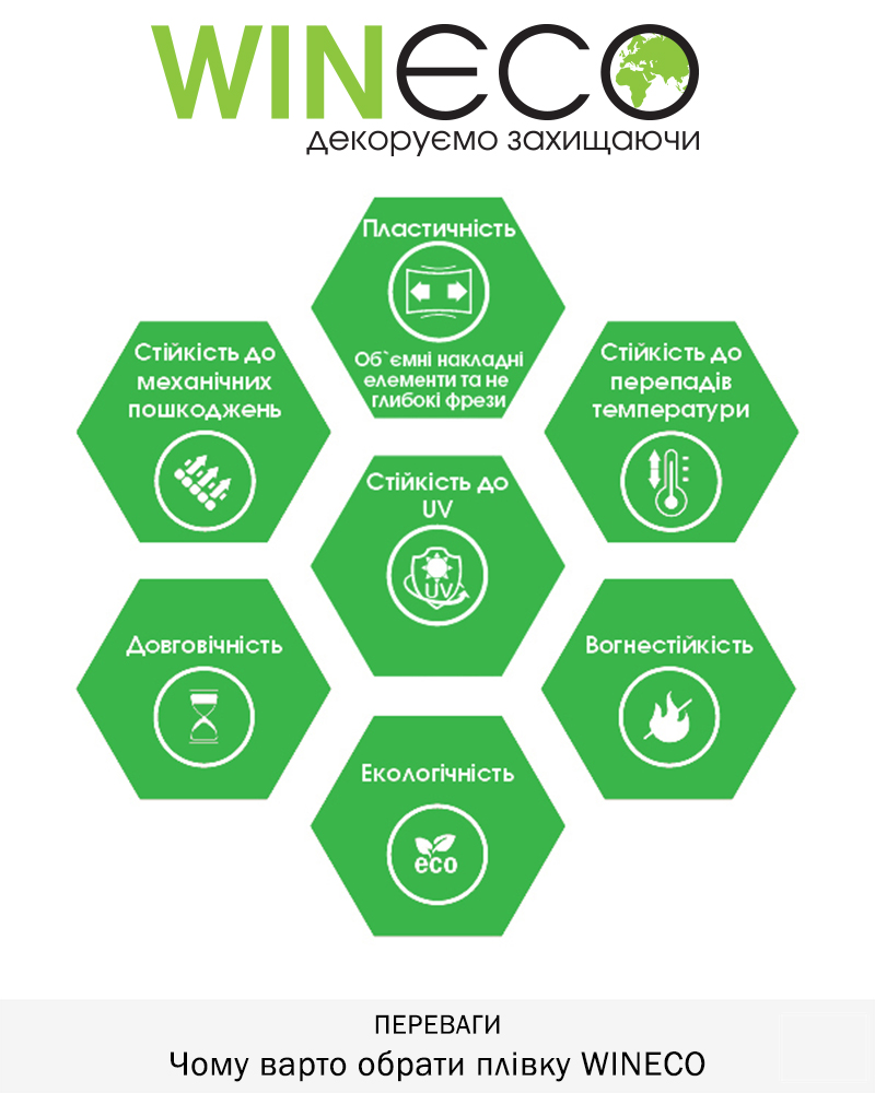 ПВХ-плівка WINECO призначена для широкого спектру застосування – її можна наносити на двері та дверні накладки, підвіконня, сендвіч-панелі, меблі та декоративні панелі стін тощо. Придатна для зовнішнього та внутрішнього використання: стійка до ультрафіолету, перепадів температури, вологи і механічних пошкоджень. Термопластична, легко приймає форму кутів, увігнутих та випуклих поверхонь, точно повторюючи контури.