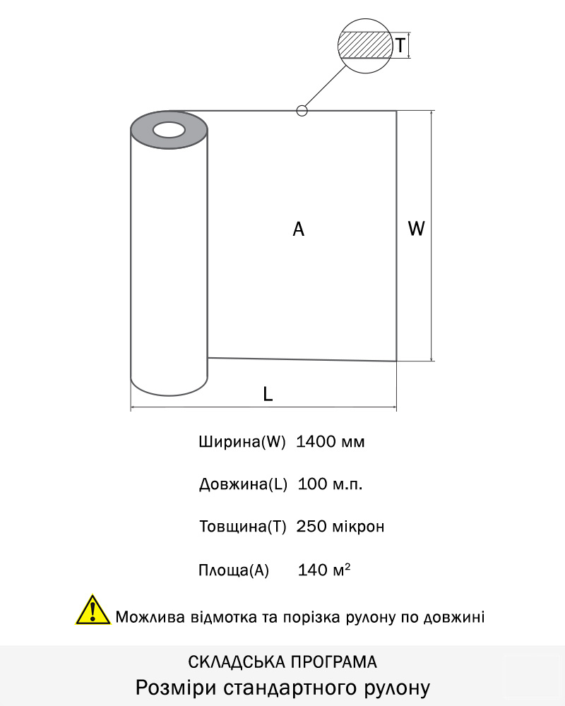 Рулони шириною 1400мм, довжиною 150м.п., товщина 0,200мм. Можлива відмотка по довжині та порізка по ширині.