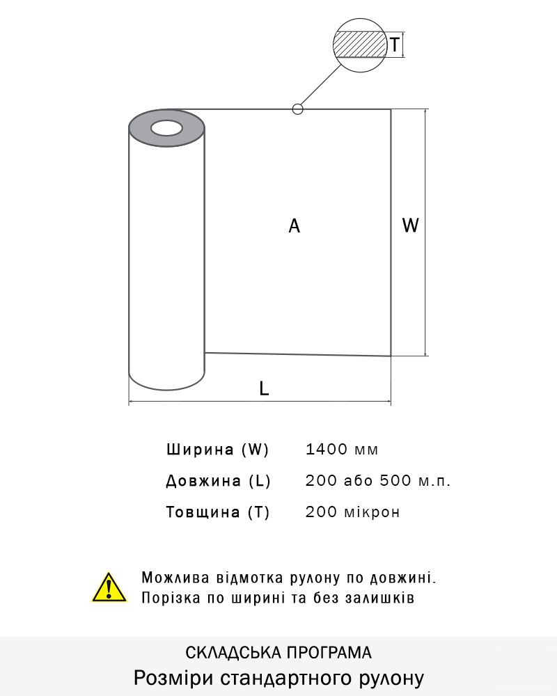 Рулони шириною 1320мм, довжиною 300-500м.п., товщина 0,200мм. Можлива відмотка по довжині та порізка по ширині.