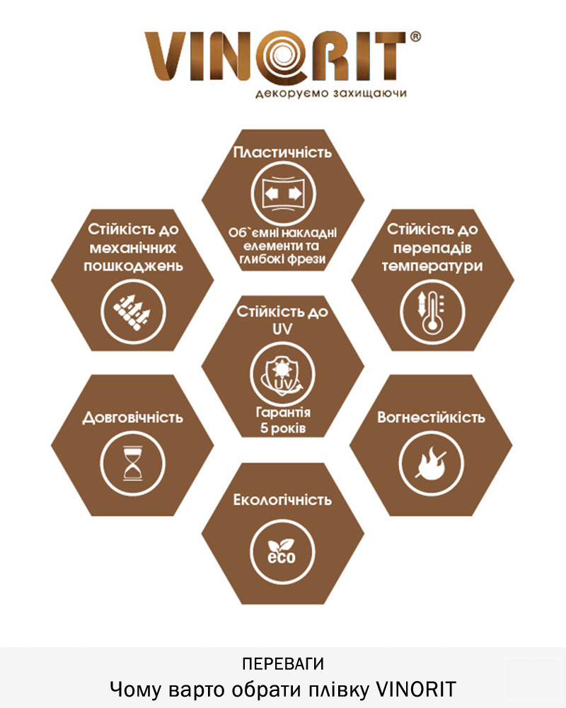 ПВХ-покриття VINORIT® - спеціально розроблене для оздоблення вхідних дверей. Придатне для зовнішнього та внутрішнього використання: стійке до ультрафіолету, перепадів температури, вологи і механічних пошкоджень. Термопластичне, легко приймає форму кутів, увігнутих та випуклих поверхонь, точно повторюючи контури.