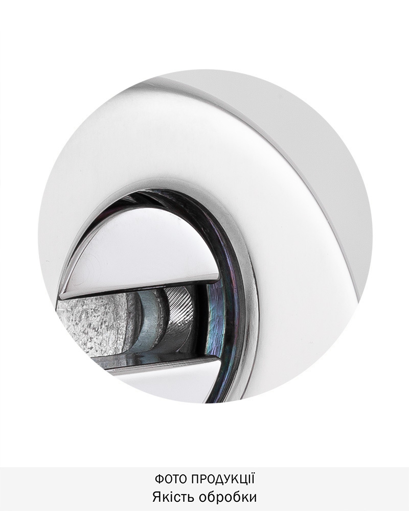 Обробка хром полірований. Одна із найпоширеніших та найстійкіших обробок. Має поліровану дзеркальну поверхню сріблястого кольору. Добре виглядає як на темних так і на світлих дверях всіх кольорів. Підходить до всіх стилів інтер’єрів.