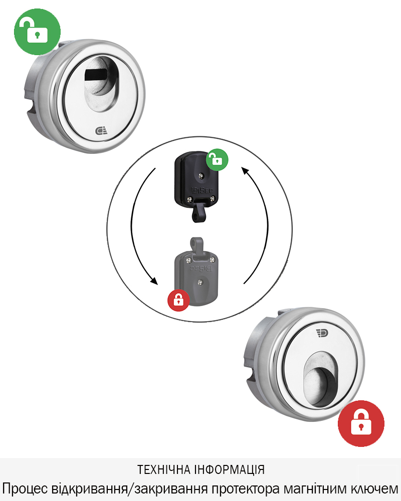 Захисний протектор моделі 3G2,з магнітним ключем призначений для захисту циліндрового механізму стандарту DIN, від зламу. Захисна шторка броненакладки, додатково захищає ключний отвір від потрапляння сторонніх предметів, вандалізму, підбору відмичок.