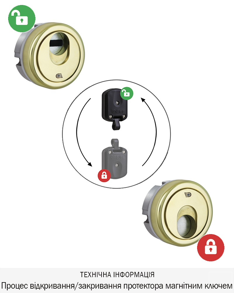 Захисний протектор моделі 3G2,з магнітним ключем призначений для захисту циліндрового механізму стандарту DIN, від зламу. Захисна шторка броненакладки, додатково захищає ключний отвір від потрапляння сторонніх предметів, вандалізму, підбору відмичок.