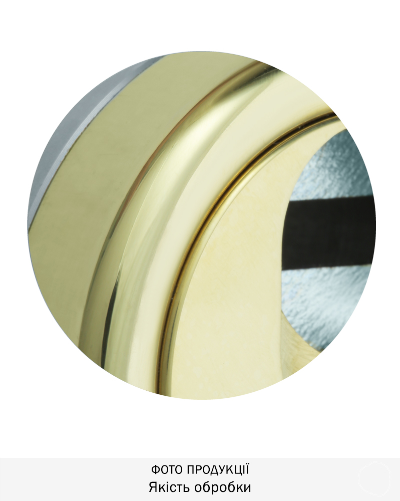Обробка латунь PVD, має яскраво жовтий колір та поліровану поверхню. Обробка стійка до подряпин та впливу зовнішнього середовища. Найкраще виглядає на темних дверях, підходить до інтер’єрів у класичному стилі.