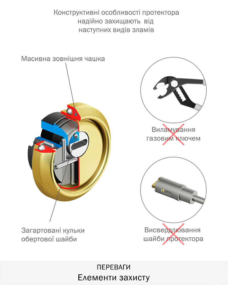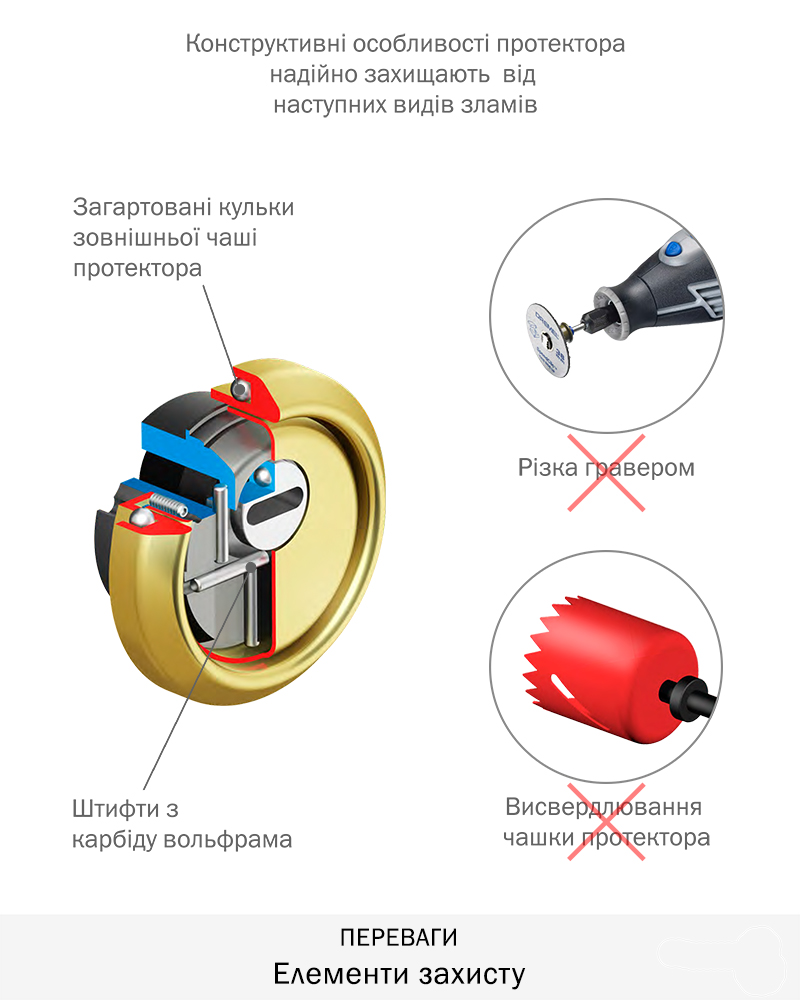 -В корпус протектора вмонтовані спеціальні штифти з карбіду вольфрама, для запобігання свердлінню.