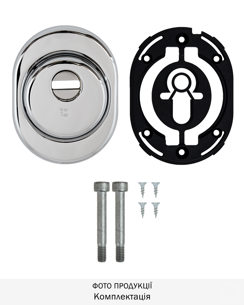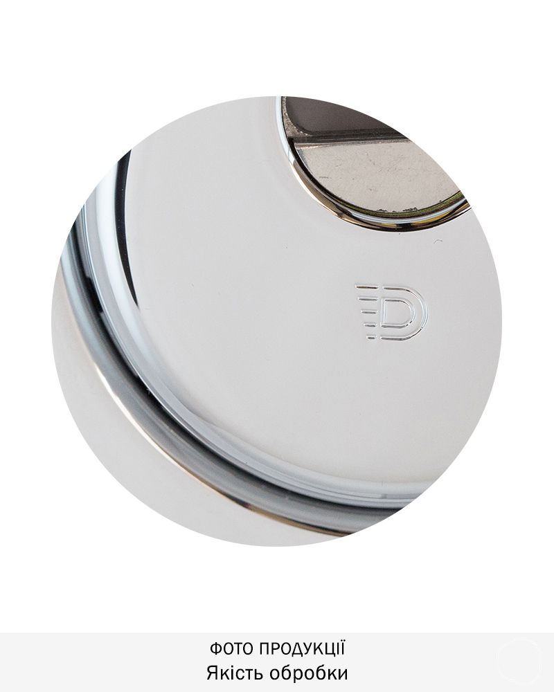 Обробка хром полірований. Одна із найпоширеніших та найстійкіших обробок. Має поліровану дзеркальну поверхню сріблястого кольору. Добре виглядає як на темних так і на світлих дверях всіх кольорів. Підходить до всіх стилів інтер’єрів.