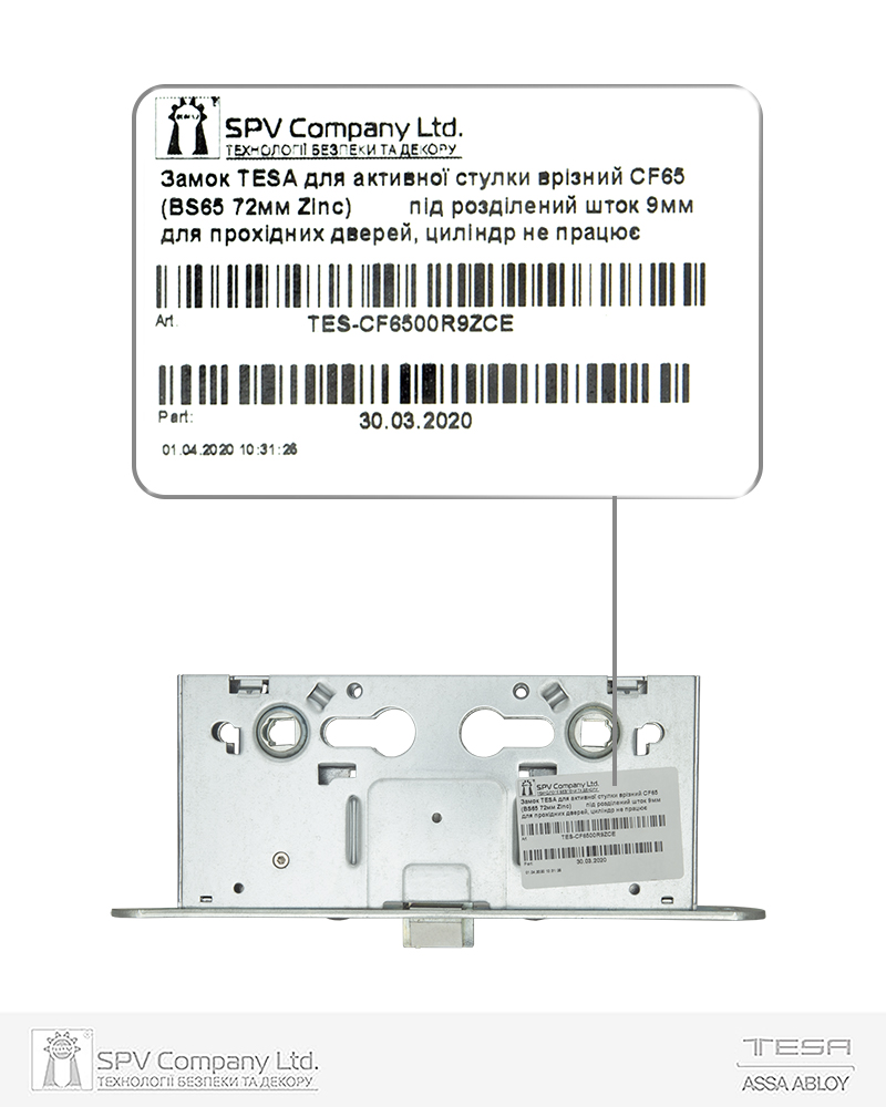 Замок врізний TESA CF65 з панік функцією призначений для встановлення в одностулкові двері або в активну стулку прохідних дверей для яких не передбачено замикання на ключ з жодної із сторін. Хоча в замок можна встановити циліндр, наприклад, щоб зберегти зовнішній вигляд дверей, проте замкнути замок неможливо. Використовується разом з пристроями антипаніки врізного типу TESA 1970 та QUICK1E.