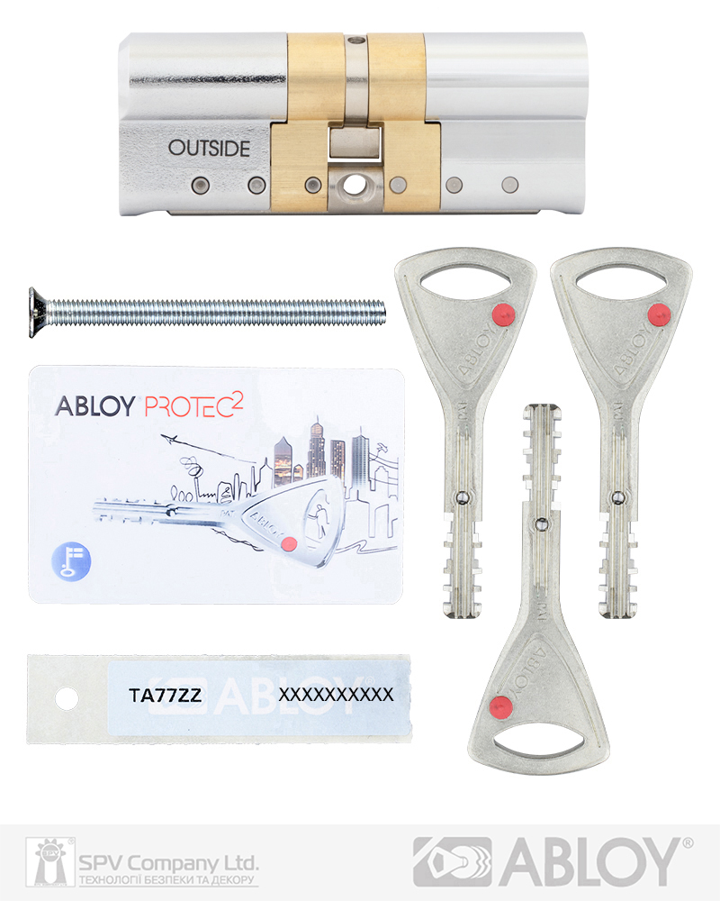 Комплектація: циліндр, 3 ключі, персональна картка+ персональна кодова наліпка, кольорові вставки в ключ, сталевий гвинт М5х85.