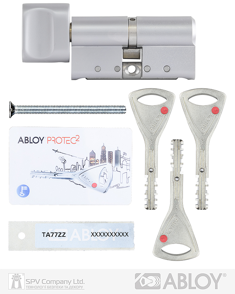 Комплектація: циліндр, 3 ключі, персональна картка+ персональна кодова наліпка, кольорові вставки в ключ, сталевий гвинт М5х85.