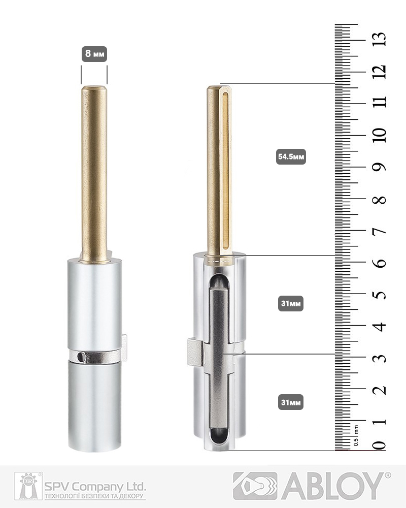 Це дозволяє не використовувати подовження для внутрішньої сторони циліндру (31 мм) на дверях різної товщини.