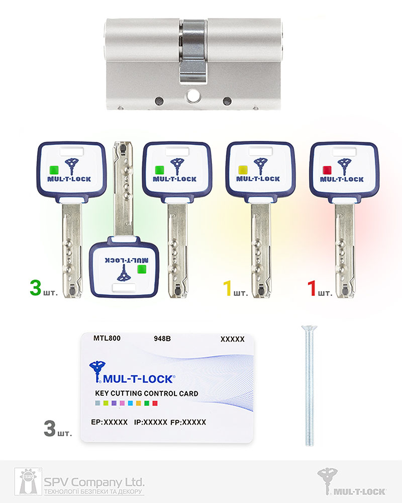 5 двокольорових ключів (3 ключі з зеленою міткою для щоденного використання, 4-й ключ з жовтою міткою для перекодування циліндра, 5-й ключ з червоною міткою для другого перекодування циліндра),