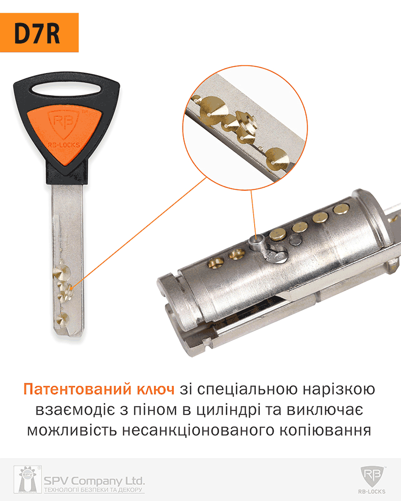 •    Тип механізму: піновий циліндр класу High Security зі спеціальним патентованим піном, розробленим для системи RB LOCKS D7R.