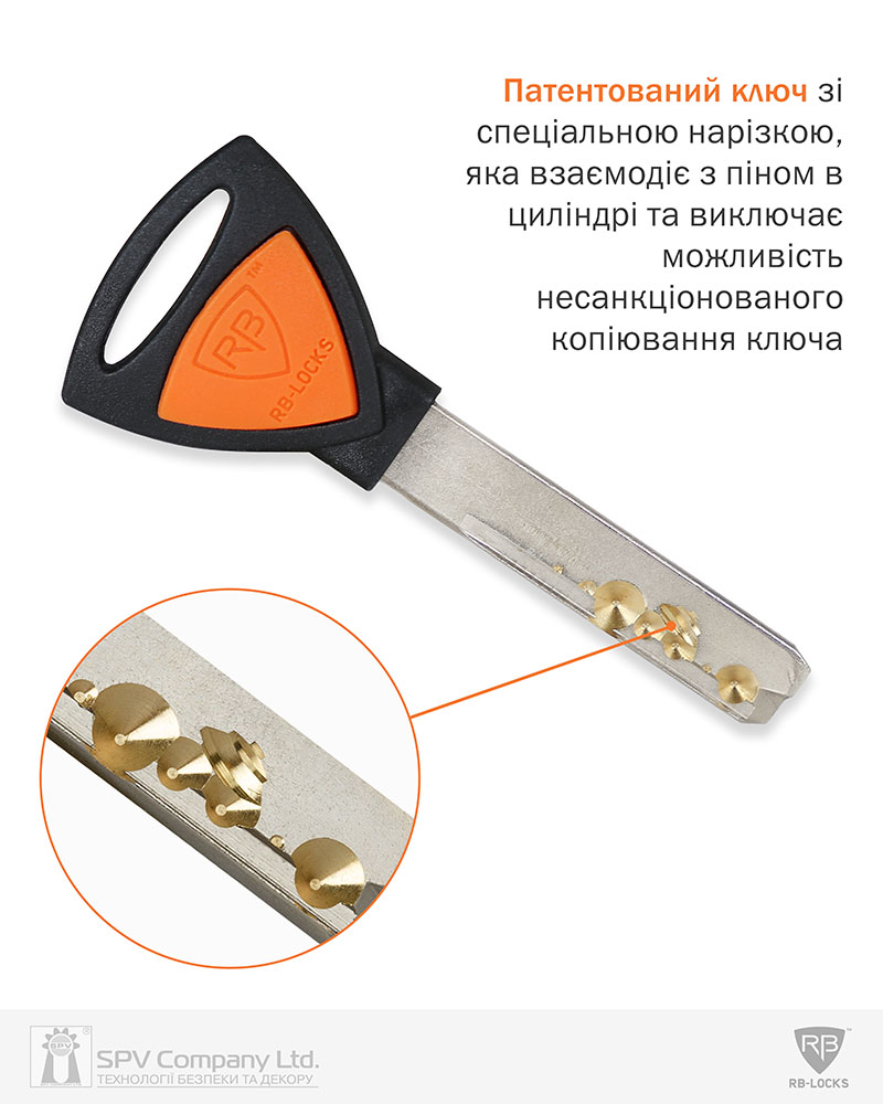 •    Тип механізму: піновий циліндр класу High Security зі спеціальним патентованим піном, розробленим для системи RB LOCKS D7R.
