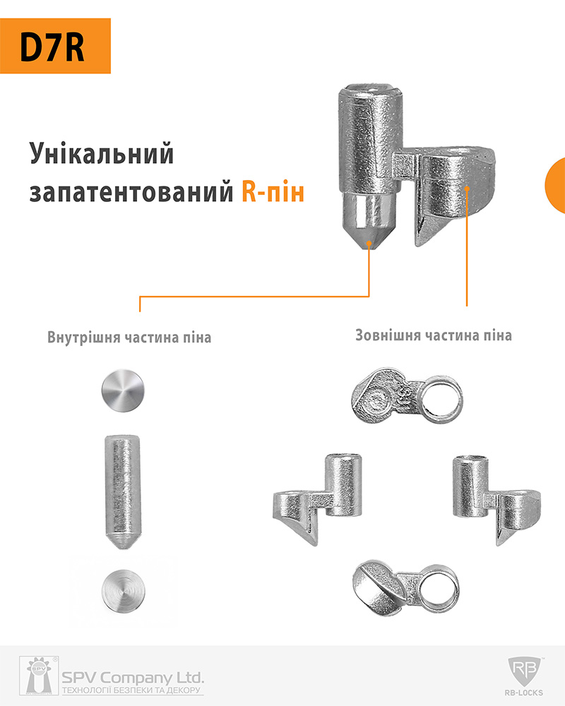 •    Тип механізму: піновий циліндр класу High Security зі спеціальним патентованим піном, розробленим для системи RB LOCKS D7R.