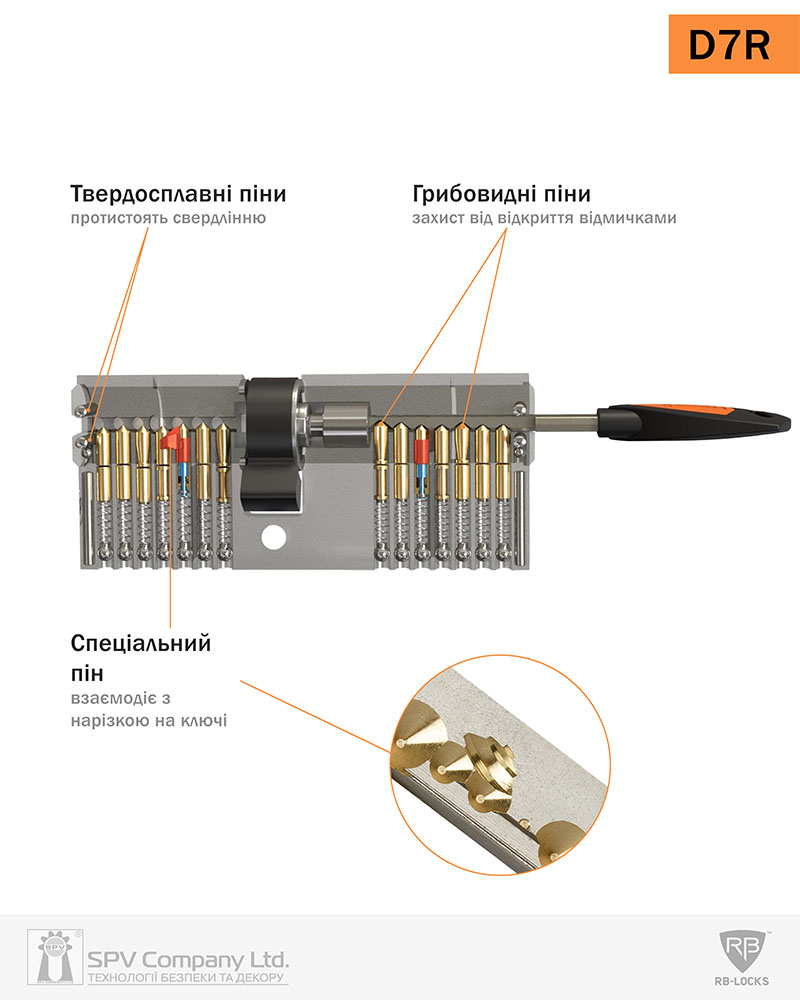 •    Тип механізму: піновий циліндр класу High Security зі спеціальним патентованим піном, розробленим для системи RB LOCKS D7R.