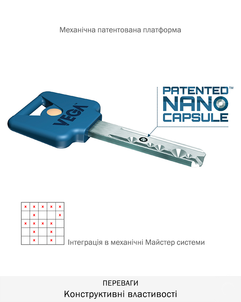 Оснащений запатентованою системою подвійного інтерактивного елемента VEGA Nano Capsule, запобігає відмиканню циліндра методом бампінгу.