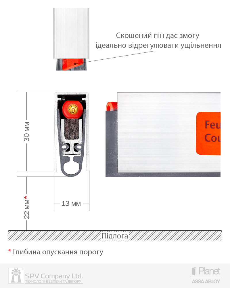 Пін – активатор (оранжевого кольору) опускання ущільнювача спеціальної скошеної форми. Завдяки цьому спрацювання ущільнювача відбувається в останній момент закривання дверей, на 5°-10°, ущільнювач менше зношується.