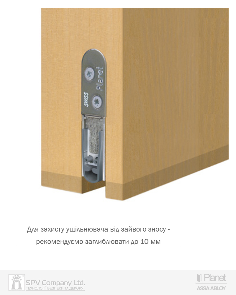 Поріг висувний для дерев'яних дверей, розташованих в приміщеннях з рівною поверхнею підлоги. Тихе, рівномірне паралельне опускання з автоматичною компенсацією ухилу підлоги. Може бути використаний для металевих, пластикових дверей.