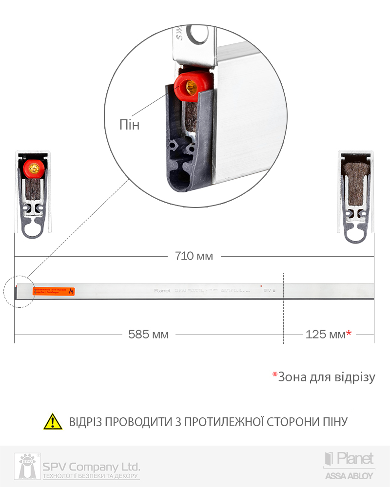 Пін – активатор (оранжевого кольору) опускання ущільнювача спеціальної скошеної форми. Завдяки цьому спрацювання ущільнювача відбувається в останній момент закривання дверей, на 5°-10°, ущільнювач менше зношується.