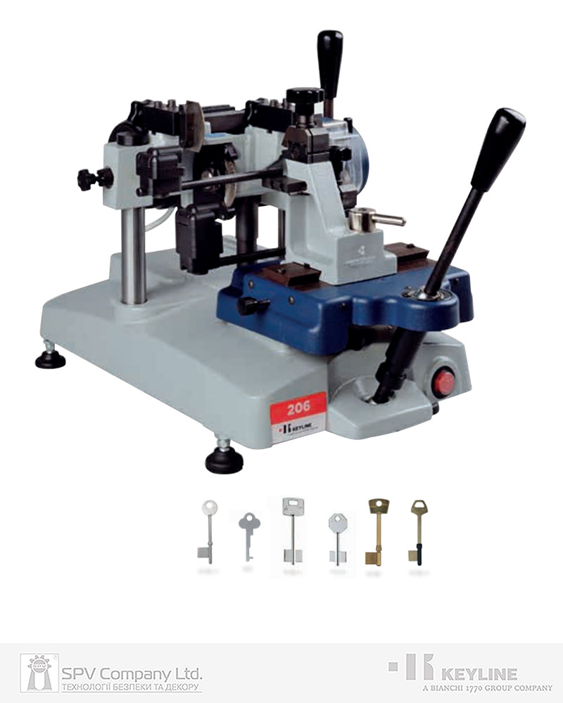BIANCHI 206 - професійний верстат-копір для нарізки ключів для врізних замків. Ефективний, надійний і комфортний. З лещатами для ключів, котрі розміщені в різних вісях, що дає можливість виготовлення сувальдних ключів будьякої довжини (довгі ключі широко застосовуються в банківських системах). Плавний рух каретки, встановленої на роликах, проводиться надзвичайно легко і точно. Один швидкісний мотор дозволяє змінювати швидкість нарізки в залежності від матеріалу заготовки, завдяки цьому досягається висока точність нарізки ключів та довгий життєвий цикл ріжучої фрези.