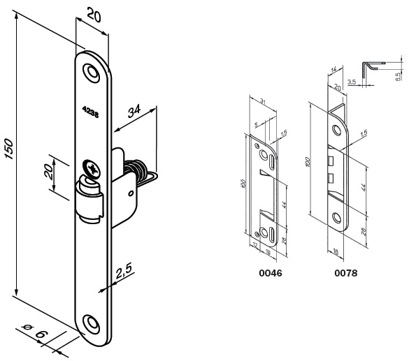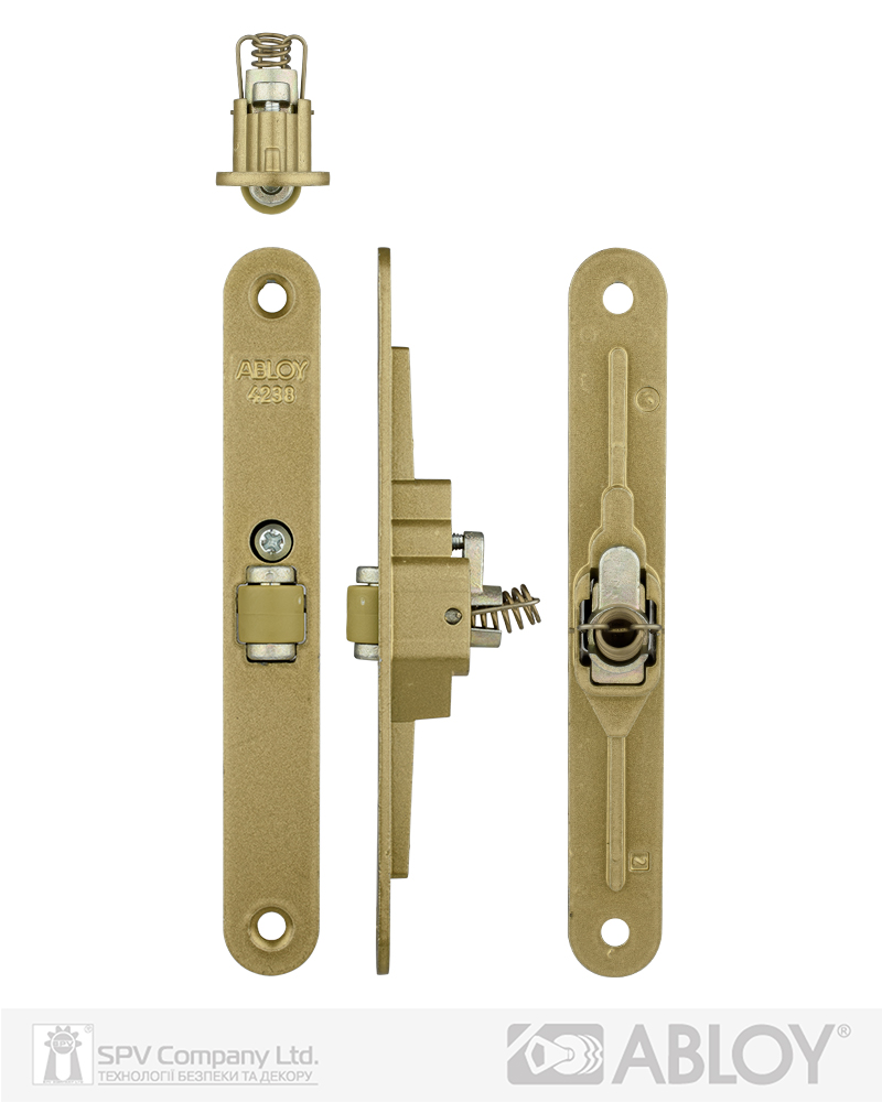 Міжкімнатна симетрична роликова заскочка ABLOY 4238. Застосовується з фіксованою ручкою. Торцева планка: обробка - порошкова фарба під латунь. Зворотна планка замовляється окремо.