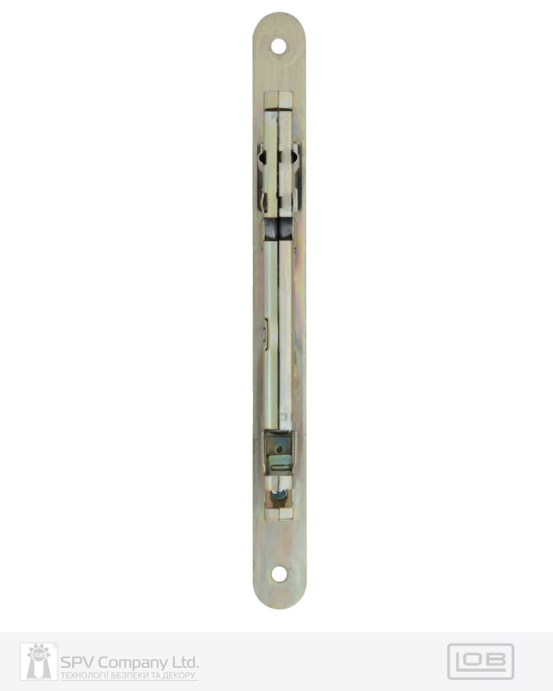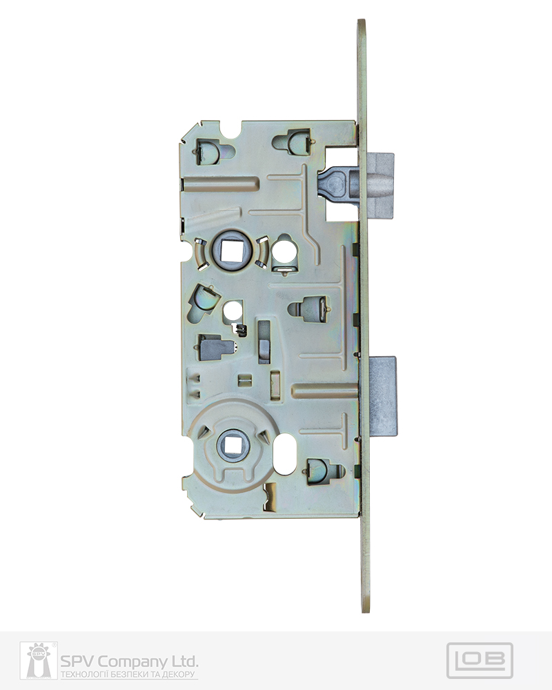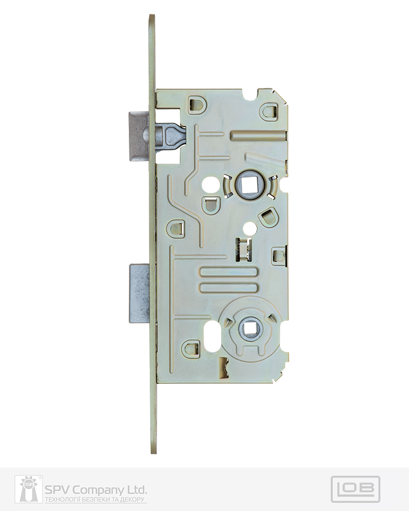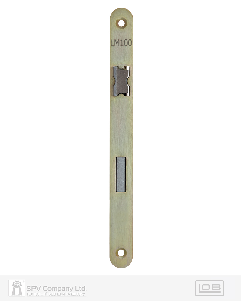 Замок для сантехнічних приміщень LM 100 WC. Замикання – поворотною кнопкою 6 мм. Засовується з фурнітурою DIN стандарту. Mіжцентрова відстань 72 мм. BackSet 50 мм. Вихід ригеля – 10 мм. Нереверсивна заскочка. Сторонність – лівий. Торцева планка: обробка – порошкова фарба під латунь. Зворотна планка замовляється окремо.
