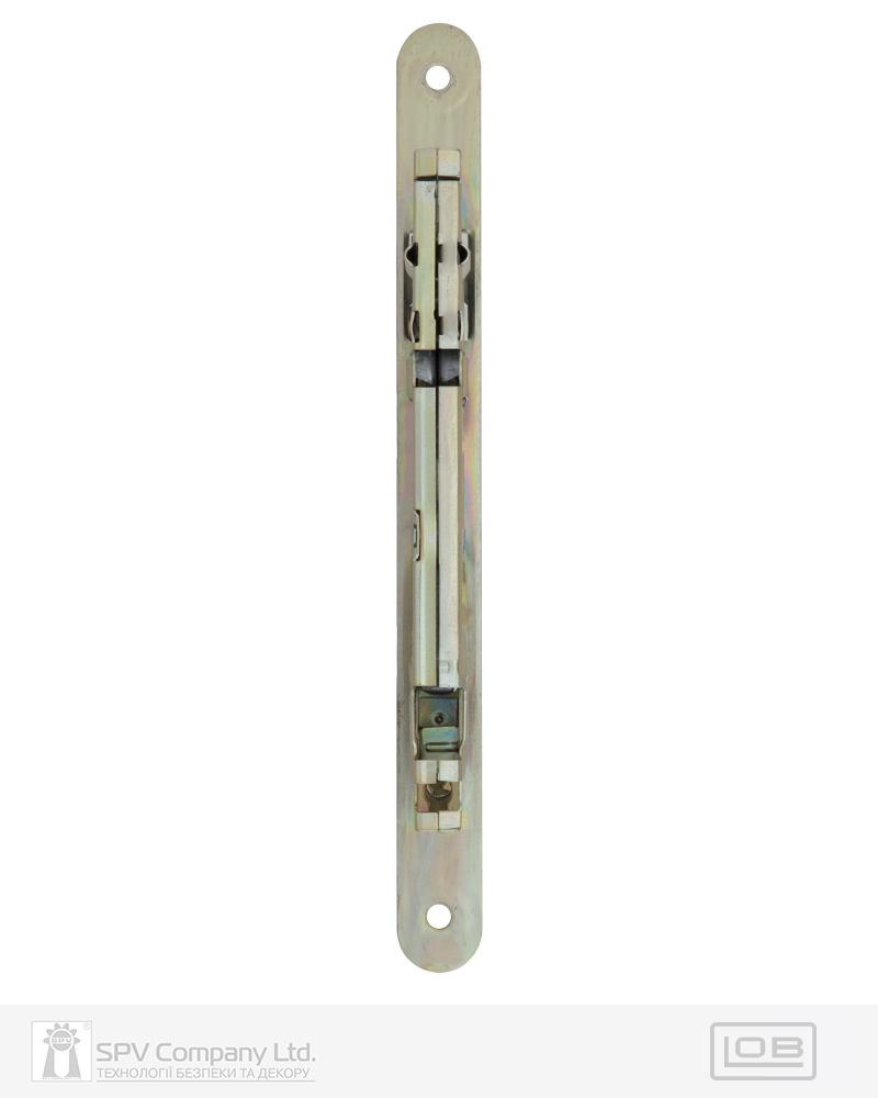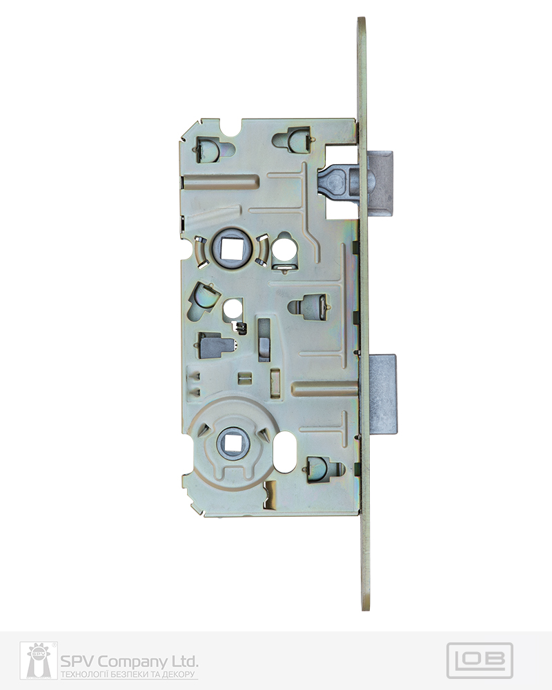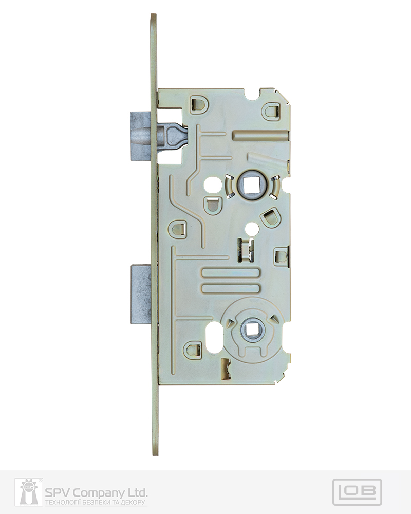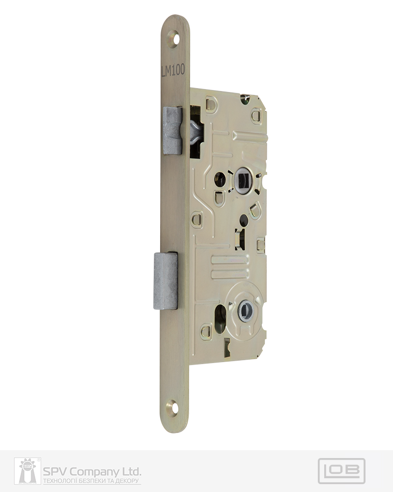 Замок для сантехнічних приміщень LM 100 WC. Замикання – поворотною кнопкою 6 мм. Засовується з фурнітурою DIN стандарту. Mіжцентрова відстань 72 мм. BackSet 50 мм. Вихід ригеля – 10 мм. Нереверсивна заскочка. Сторонність – прайий. Торцева планка: обробка – порошкова фарба під латунь. Зворотна планка замовляється окремо.