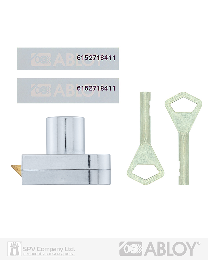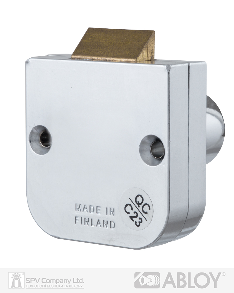 Врізний замок ABLOY OF221 з скошеним ригелем для офісних меблів (металеві, дерев`яні шкафчики для одягу, аптечки, ящики, тощо). Максимальна товщина дверей 19 мм. Циліндр Classic з 7 дисками. Гніздо циліндра із хромованого цинка, ригель із латуні. Комплектація: замок, 2 ключі та кодова картка.