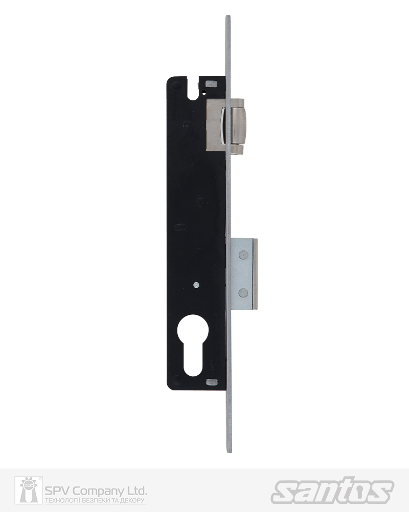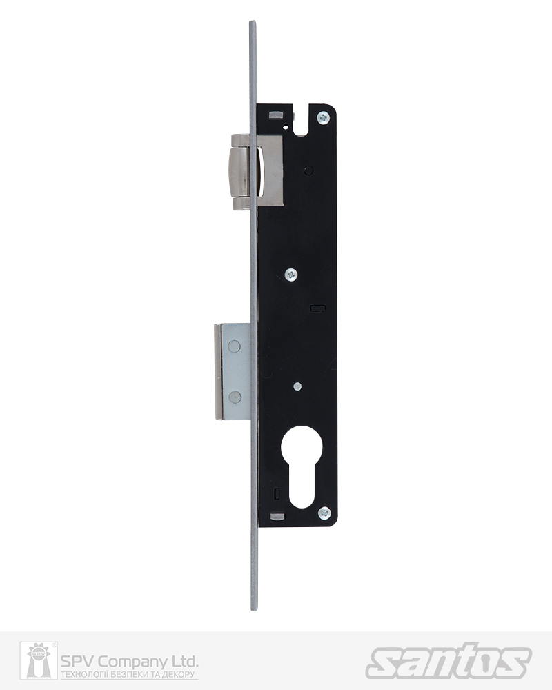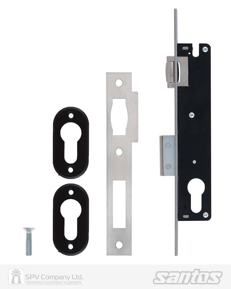 Основний замок SANTOS Profile Lock 720 для профільних дверей під циліндр DIN. Має роликову заскочку. Застосовується з ручками-скобами ABLOY. BackSet 30 мм. Глибина корпуса 45 мм. 1 прямий ригель. Вихід ригеля 16 мм. Сторонність – універсальний (правий/лівий). Торцева планка: обробка – нержавіюча сталь, ширина - 22 мм. Комплектація: замок, зворотна планка, пластиковий щиток чорний PZ (2шт.)
