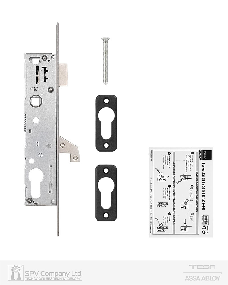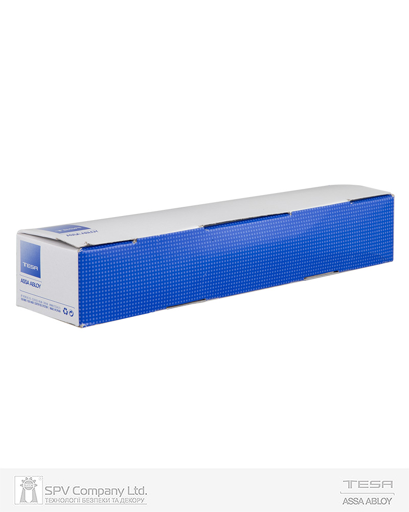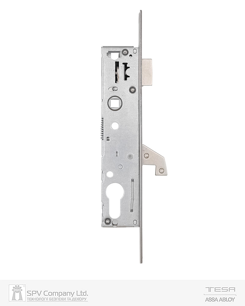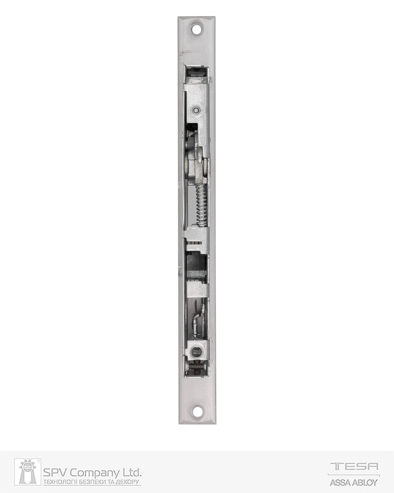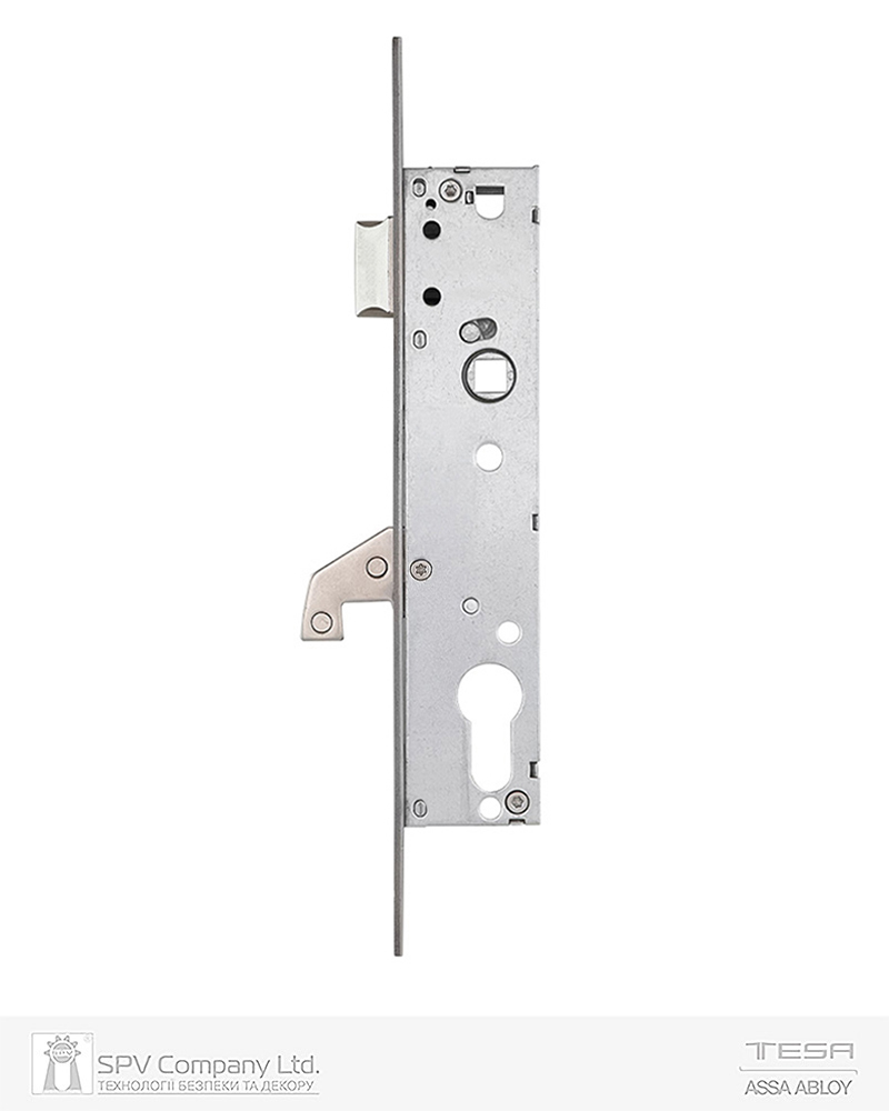 Основний замок TESA 4240BE для профільних дверей під циліндр DIN. Сумісний з фурнітурою ROSTEX для профільних дверей. Міжцентрова відстань 85 мм. BackSet 20 мм. Глибина корпуса 33 мм. 1 багатошаровий гакоподібний ригель. Вихід ригеля – 25,4 мм. Реверсивна заскочка. Сторонність – універсальний (правий/лівий). Торцева планка: обробка – нержавіюча сталь,