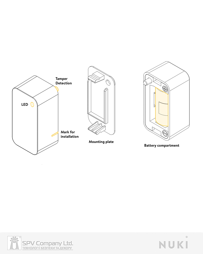 Бездротовий датчик стану призначений для встановлення разом з Електронними контролерами NUKI Smart Lock 3.0, NUKI Smart Lock 3.0 Pro та NUKI Smart Lock 4.0 Pro. Забезпечує отримання інформації про стан дверей (відчинені або зачинені) та попередження про те, що двері залишені відчиненими.