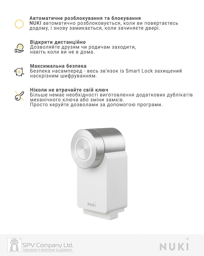 Опції відмикання: з мобільного додатку NUKI, за допомогою пульта дистанційного керування NUKI FOB, за персональним кодом з електронного зчитувача NUKI Keypad, за відбитком пальцю або кодом з електронного зчитувача NUKI Keypad 2.0, автоматичне відмикання при наближенні (на смарфоні має бути увімкнуті Bluetooth та геолокація).