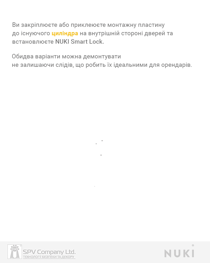 Може бути встановлений практично на будь який циліндр ключ-ключ (для можливості відмикання циліндру механічним ключем ззовні циліндр повинний бути з функцією "emergency", яка дозволяє відмикати циліндр ззовні, коли зсередини вставлений ключ) та ключ тумблер (потребує використання спеціального адаптеру NUKI).
