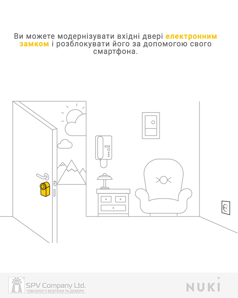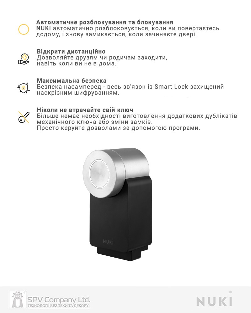 Опції відмикання: з мобільного додатку NUKI, за допомогою пульта дистанційного керування NUKI FOB, за персональним кодом з електронного зчитувача NUKI Keypad, за відбитком пальцю або кодом з електронного зчитувача NUKI Keypad 2.0, автоматичне відмикання при наближенні (на смарфоні має бути увімкнуті Bluetooth та геолокація).