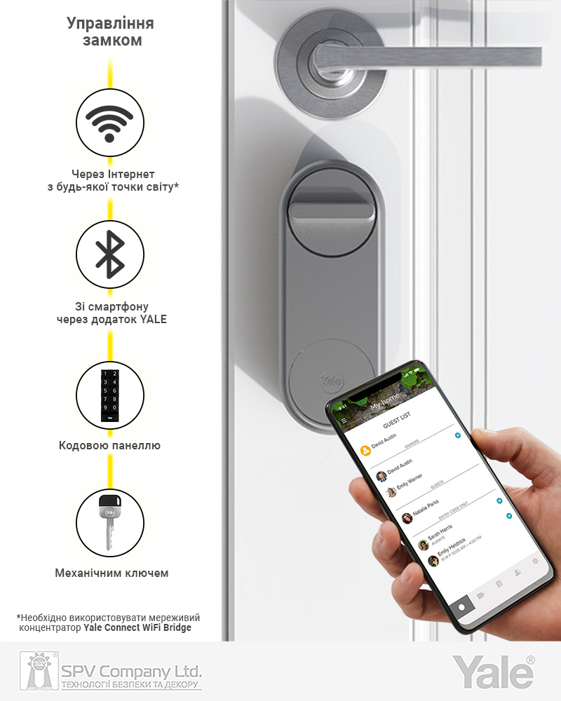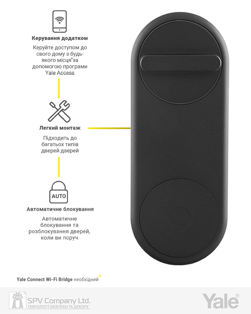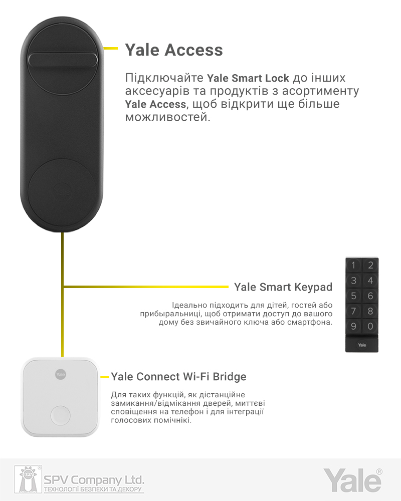 - Двофакторна безпека: Обліковий запис Yale Access захищений 2-факторною аутентифікацією, яка потребує паролю та перевірки системою ідентичності користувача та базується на адресі електронної пошти або номеру телефону