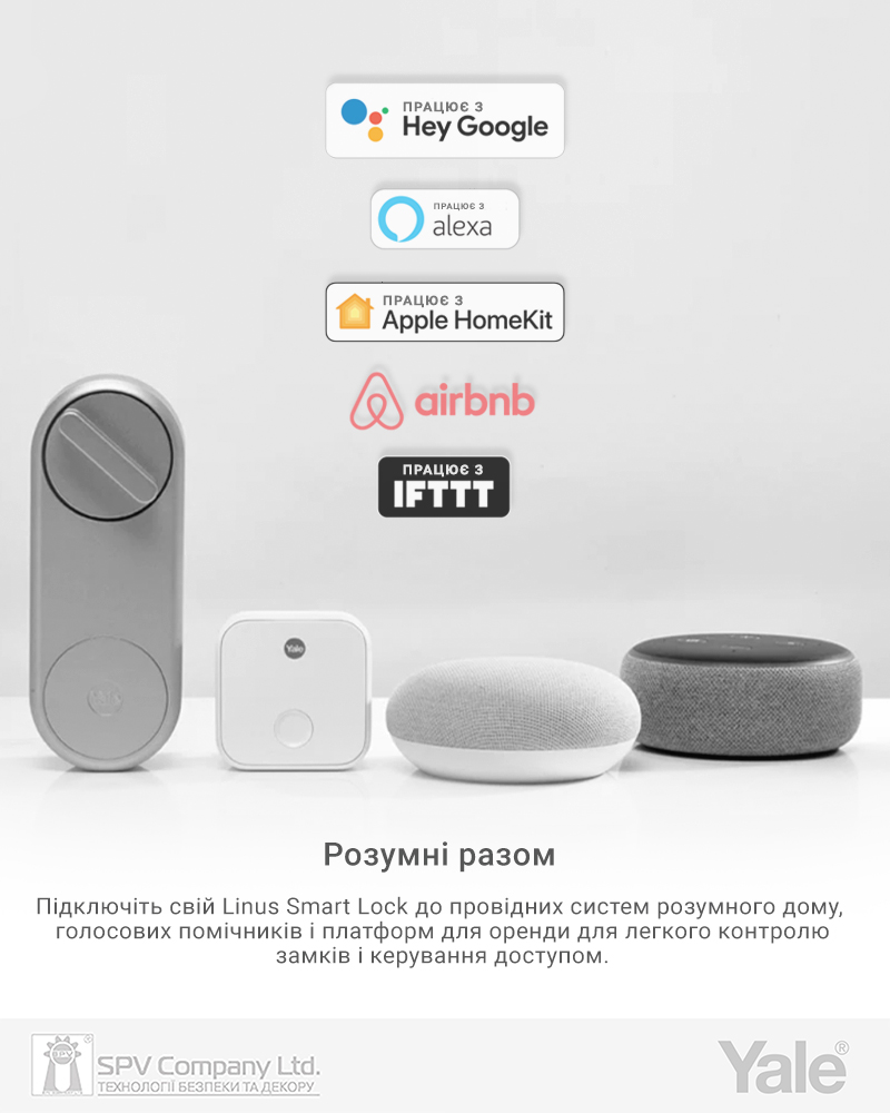 Сумісний з системами Smart Home: Apple HomeKit, Hey Google, Amazon Alexa, airbnb, а також з системами безпеки Ajax.