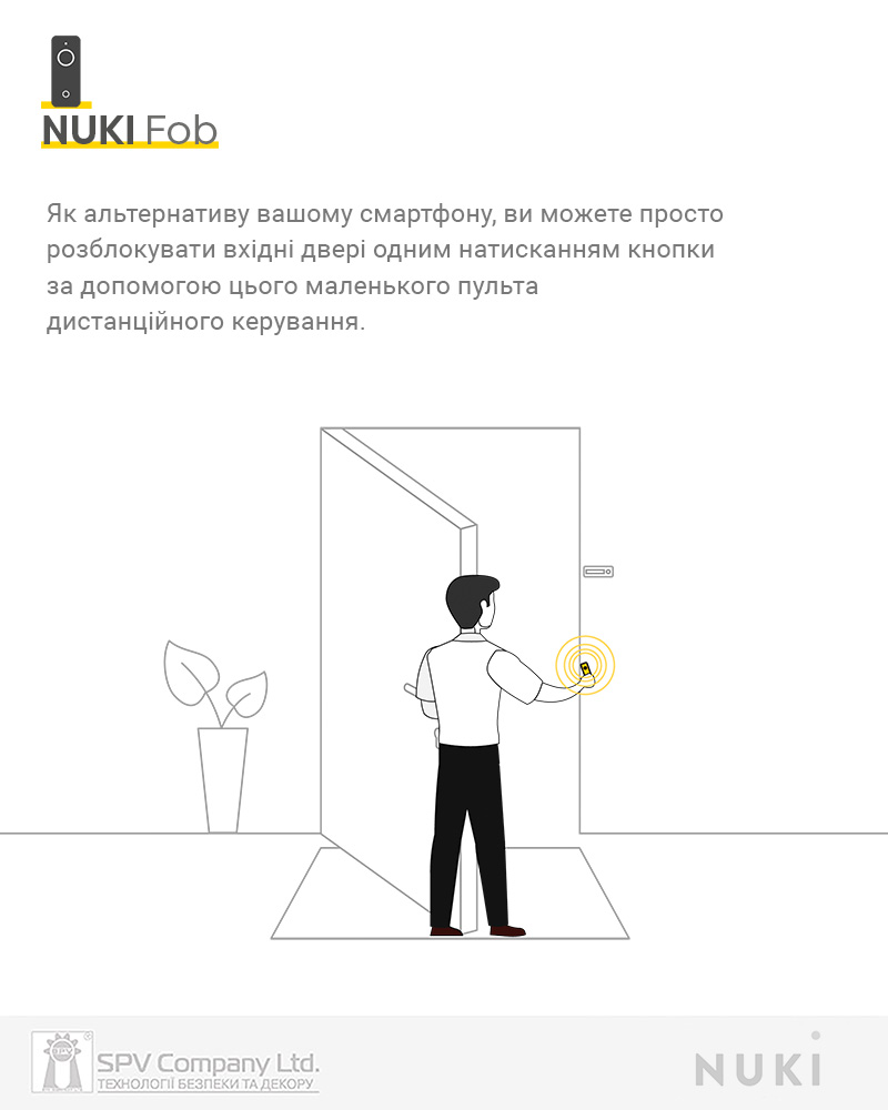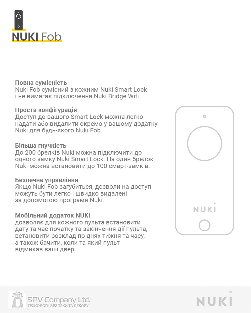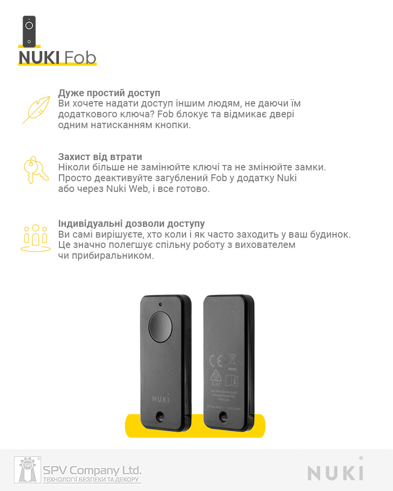 До кожного контролеру NUKI може бути прив’язано до 200 пультів NUKI FOB, один пульт NUKI FOB може бути прив’язаний до 100 контролерів NUKI Smart Lock