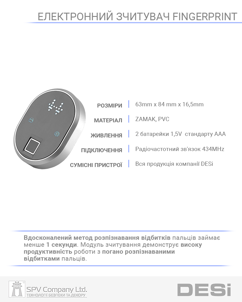 Не потребує прокладання дротів (бездротовий зв’язок з контролером DESI Utopic). Ємність пам’яті – 100 відбитків.