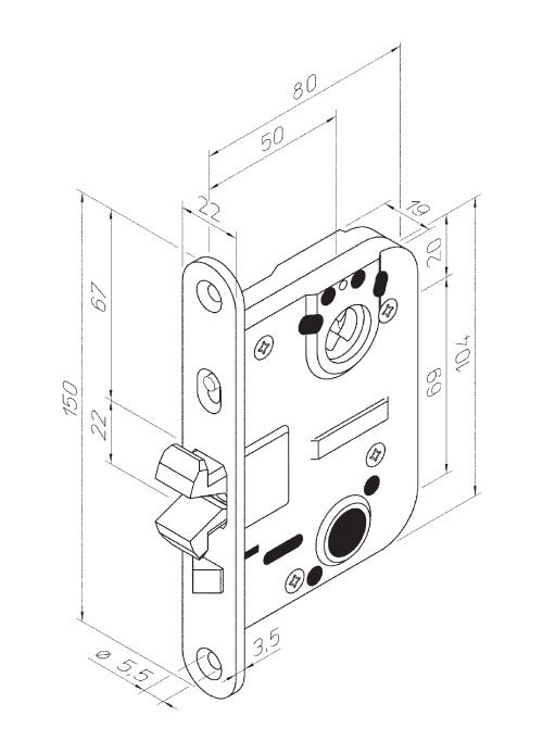 Перемикання режиму автоматичного замикання проводиться за допомогою кнопки, розташованої на передній планці . Положення кнопки: ВЕРХНЄ - автоматичне замикання при закритті дверей. Замок відмикається ключем або поворотною кнопкою. НИЖНЄ - гакоподібним ригель зафіксований всередині корпусу замка. Mіжцентрова відстань 69 мм.