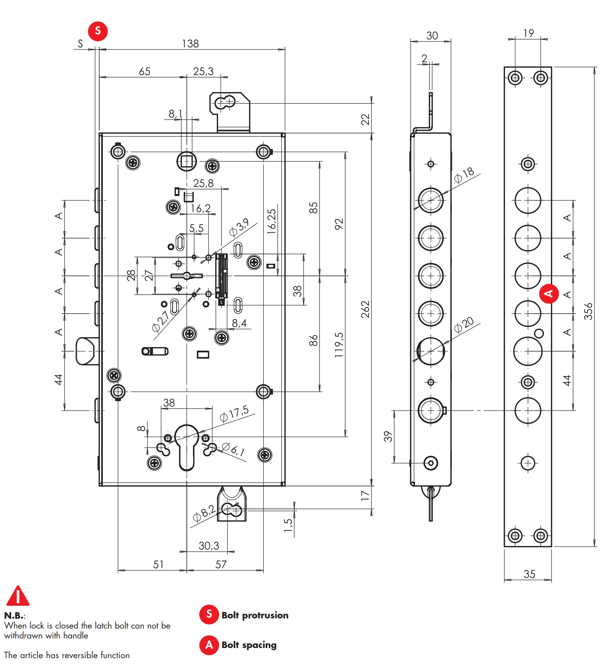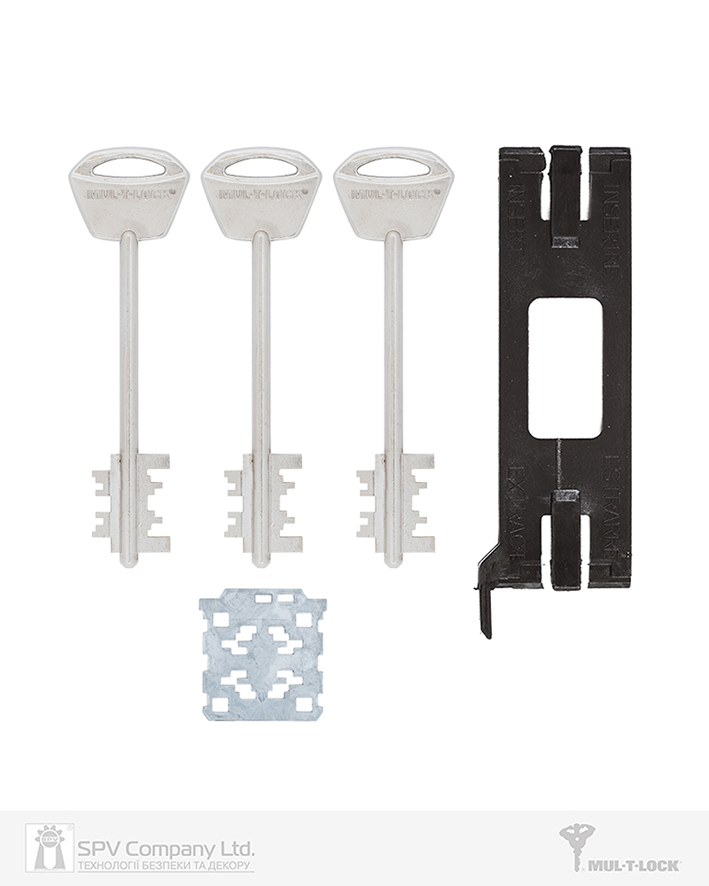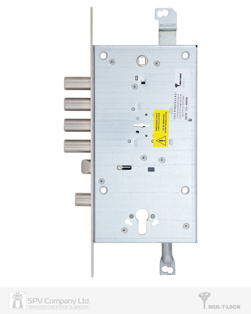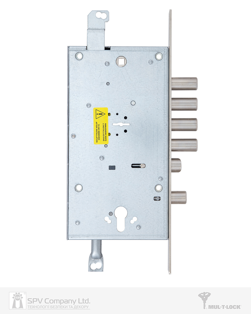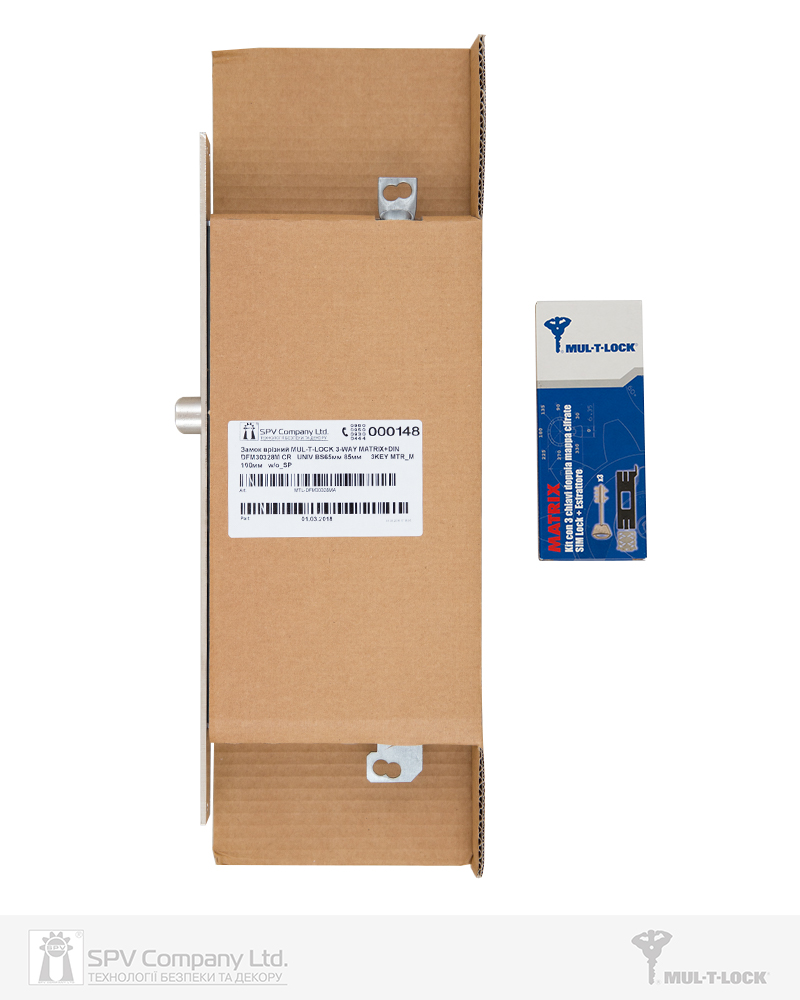 Основний замок 3-направленого замикання MUL-T-LOCK- ESETY Matrix DFM3 з двома системами замикання: циліндровий механізм стандарту EuroDIN керує додатковим ригелем та блокує «основний» сувальдний замок;