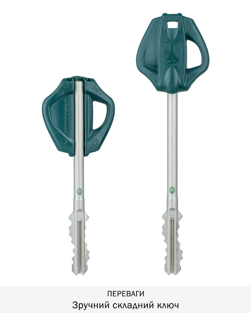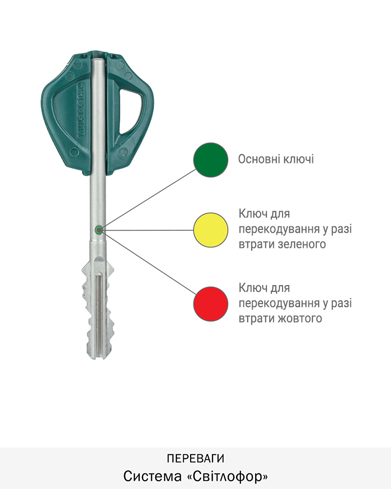 Комплектація: замок, ключі 1+3+1+1 ключів (1 монтажний ключ, 3 ключі з зеленими мітками для щоденного використання та кодова картка, 4-й ключ з жовтою та 5-й ключ з червоною мітками і кодова картка для перекодування (Система «VIP» + «Світлофор»)).
