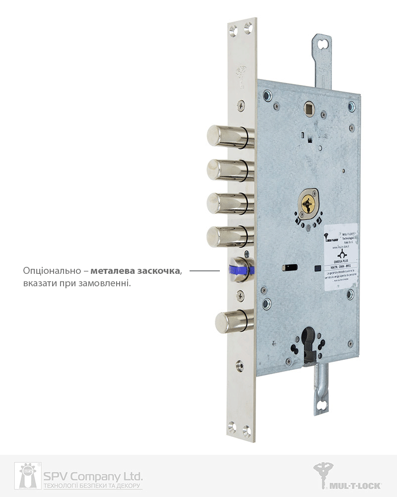 При закритому замку (висунутих ригелях) на ключ Омега фалевая защіпка не може бути втягнута в корпус дверною ручкою.