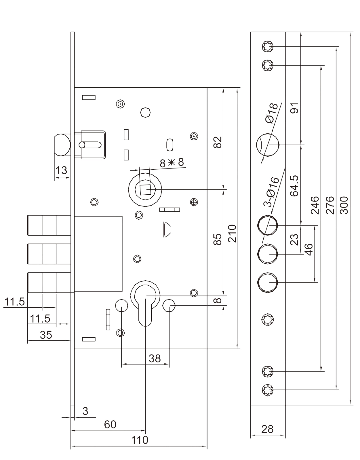 Основний врізний замок SANTOS 252RL економ-серії під циліндр DIN. на три оберта ключа.