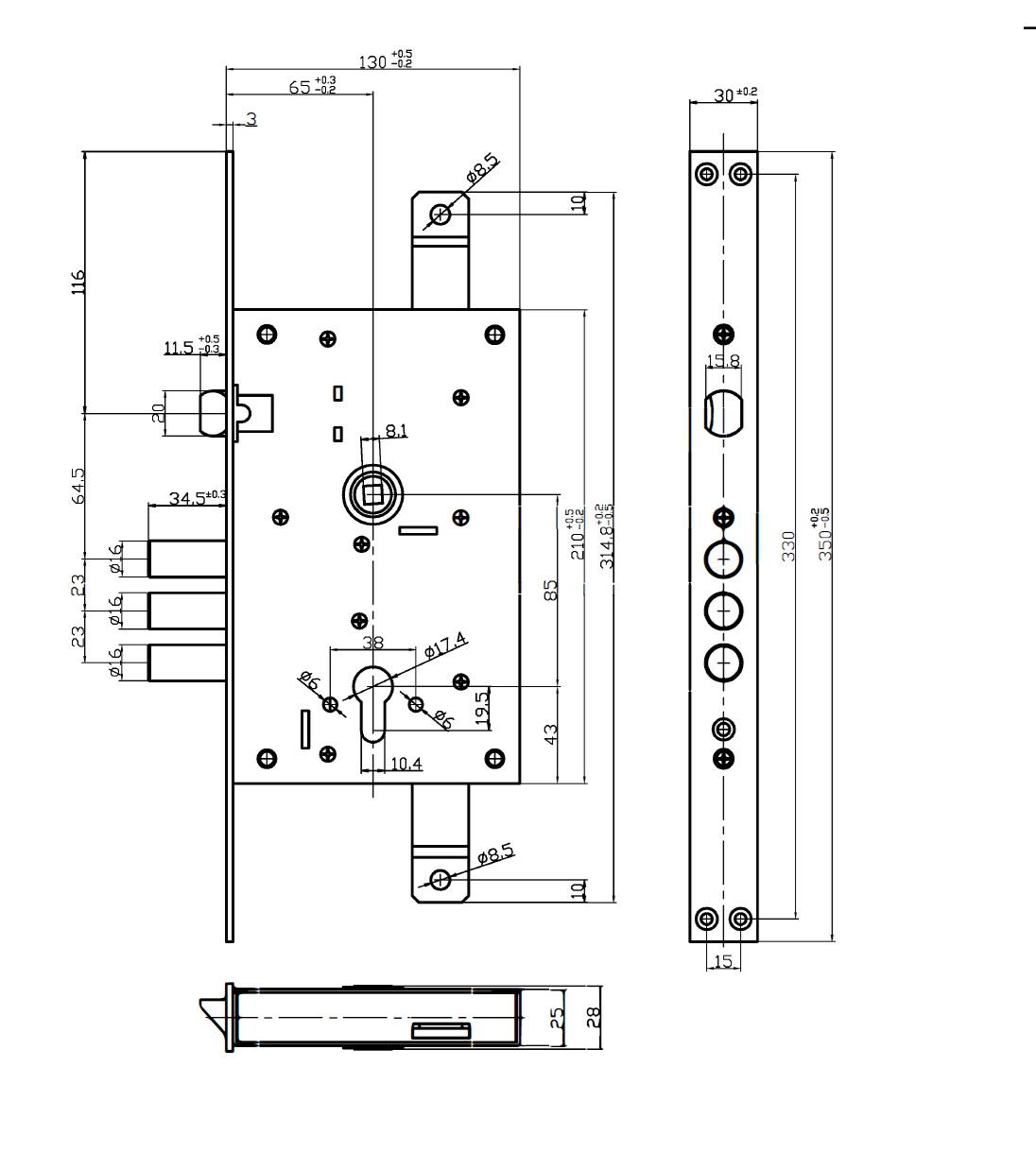 3 сталеві ригелі Ø 16 мм, вихід 34,5 мм.