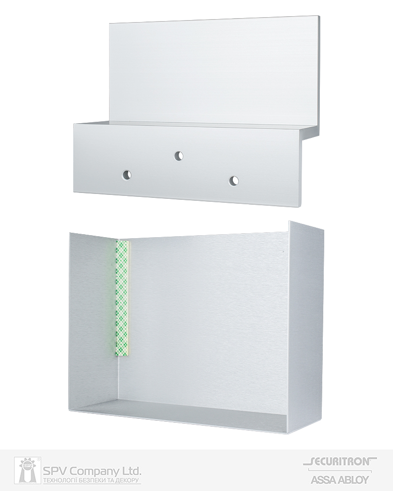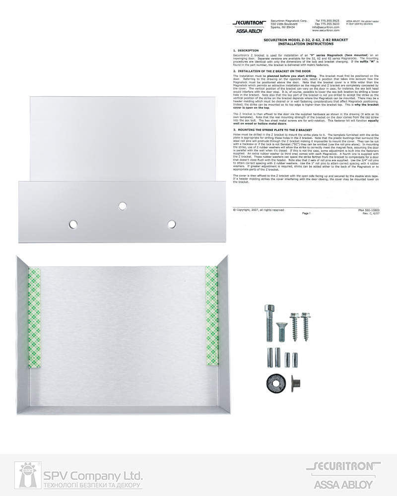 Z – образний кронштейн використовується для монтажу магнітного замка Securitron M62 (обов’язкова опція F – фронтальний монтаж) на двері, що відкриваються в середину.