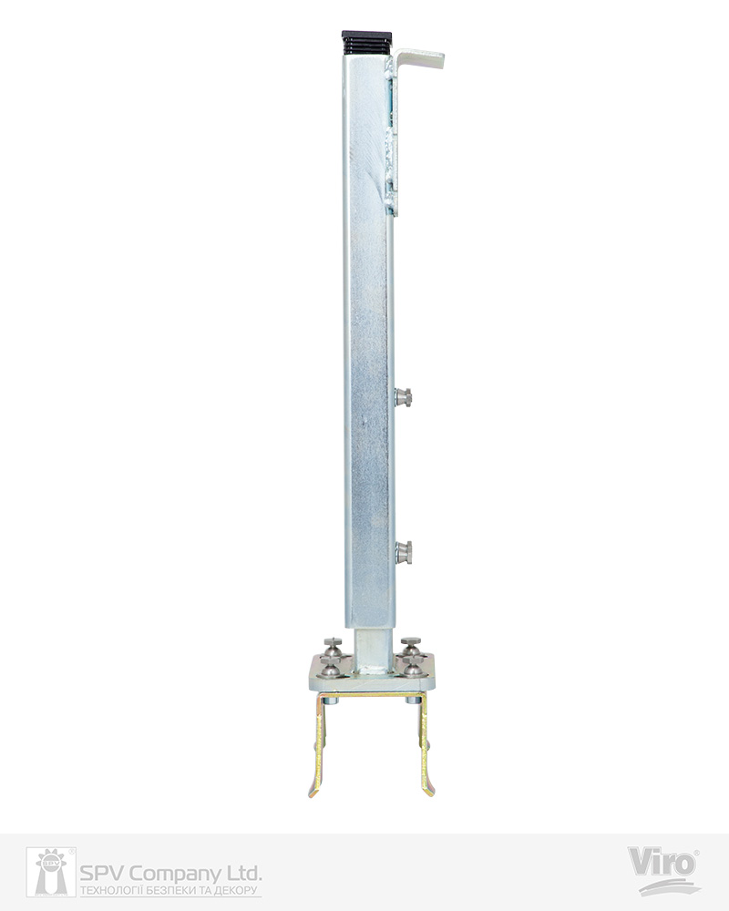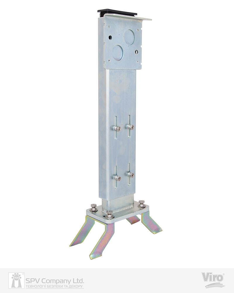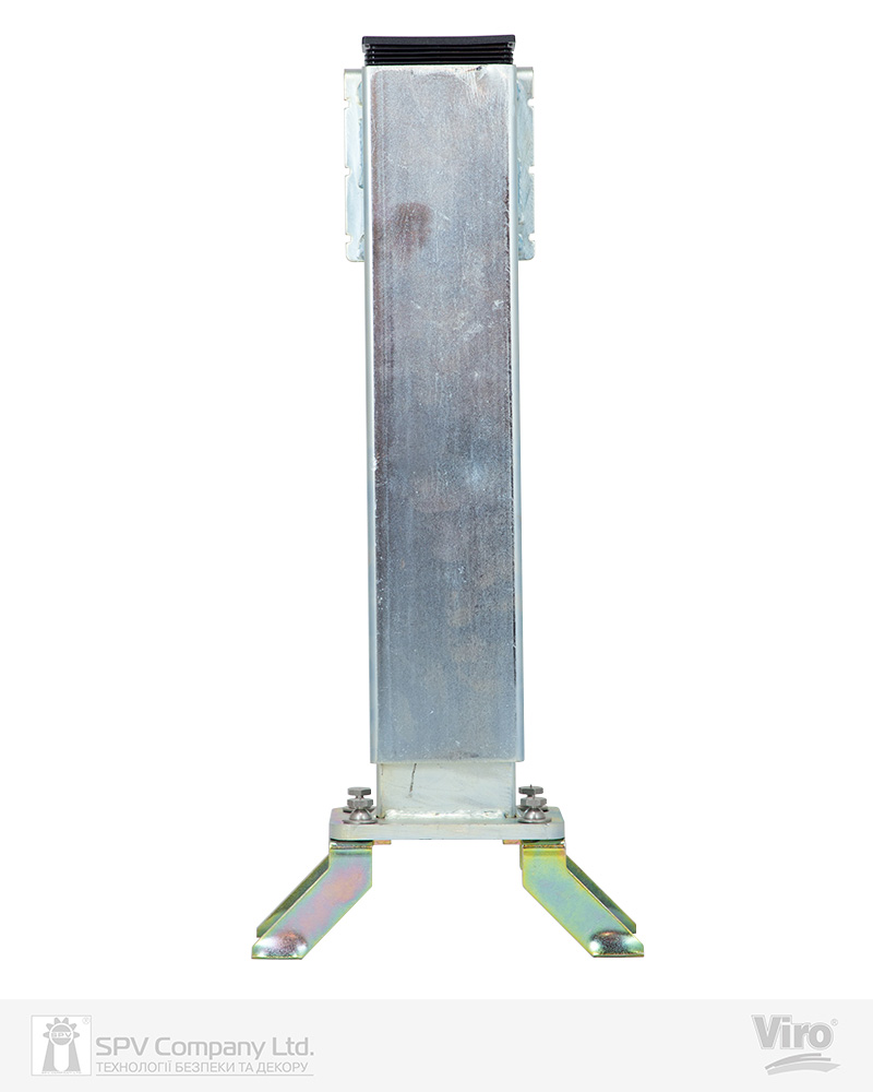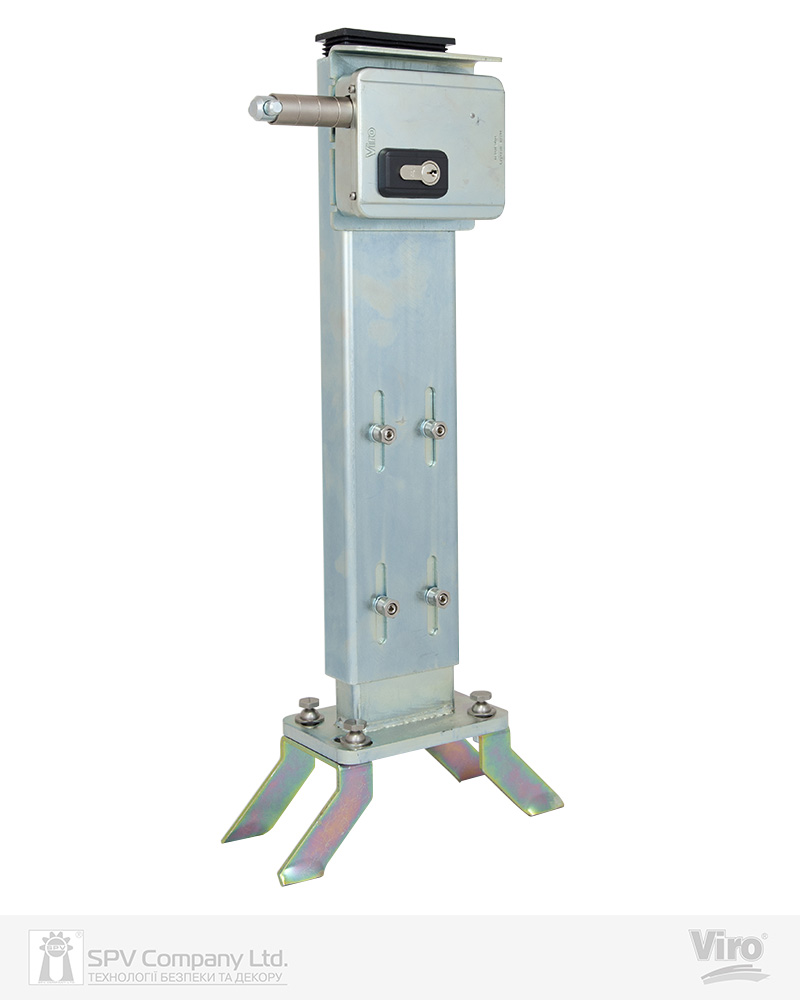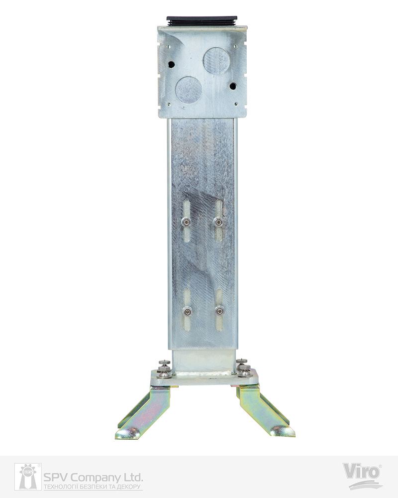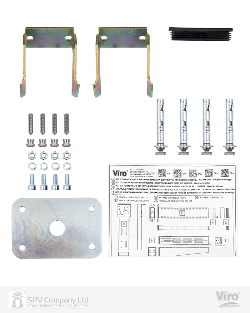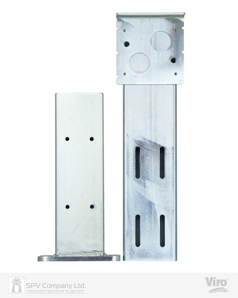 Спеціальний монтажний набір стальних запірних кронштейнів кріплення Т-форми з пластинами VIRO 7905.0600.11 призначений для фіксації високобезпечного електромеханічного накладного замка VIRO V09 з шипоподібним гарпунним механізмом замикання, що повертається в момент зачинення замка, при здійсненні горизонтального встановлення замка з внутрішньої сторони об’єкту на рамах вуличних автоматизованих відкатних воротах згідно встановлених юридичних кваліфікаційних вимог щодо захисту монтажу замка від спроб вандального опрокидування.