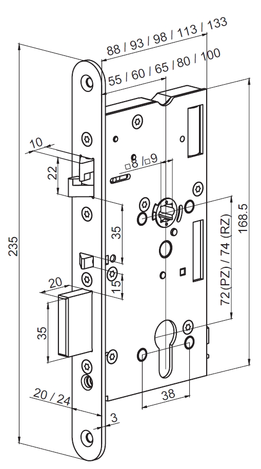 Торцова планка: 24 мм (також доступний до замовлення замок з торцевою планкою 20 мм)