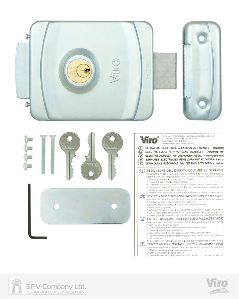 - корпус замка V9083 серії 0794, комплект пари циліндрів VIRO 791/794 спецпрофіля VIRO UN, супортні захисні накладки циліндрів, фіксована ручка, електричні елементи замка, запірна накладна універсальна планка V9083.117 для горизонтального встановлення, шестигранний ключ для регулювання виходу основного косого ригеля, монтажний комплект з елементами кріплення, паспорт-інструкція користувача, пакувальна упаковка.