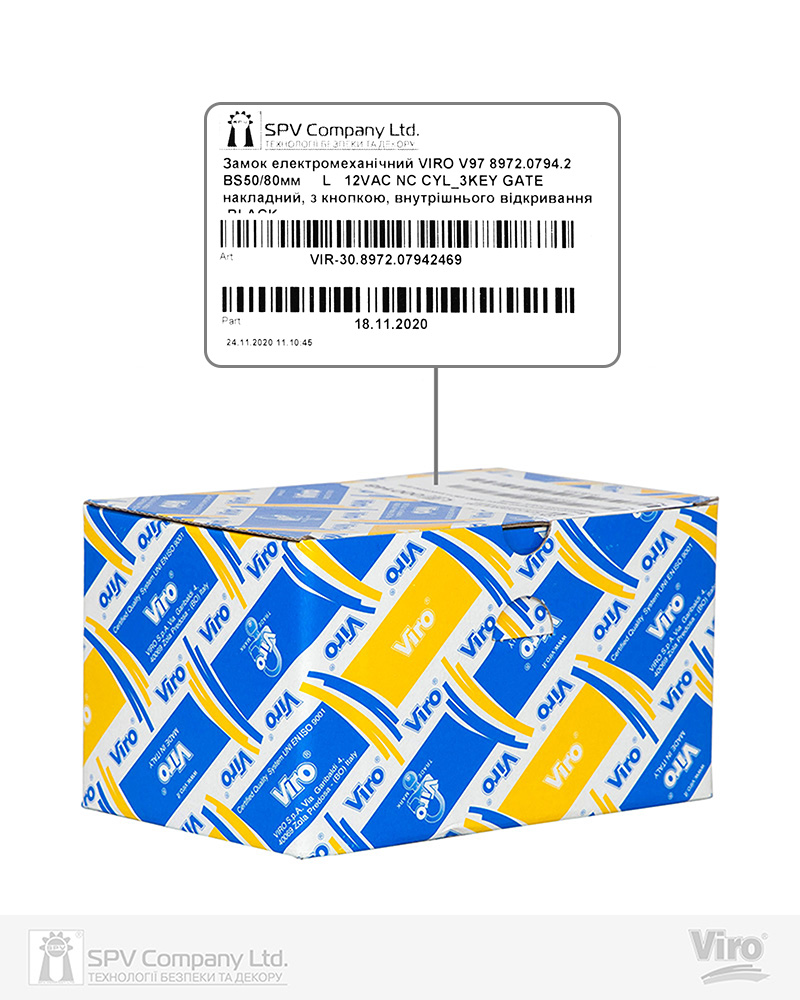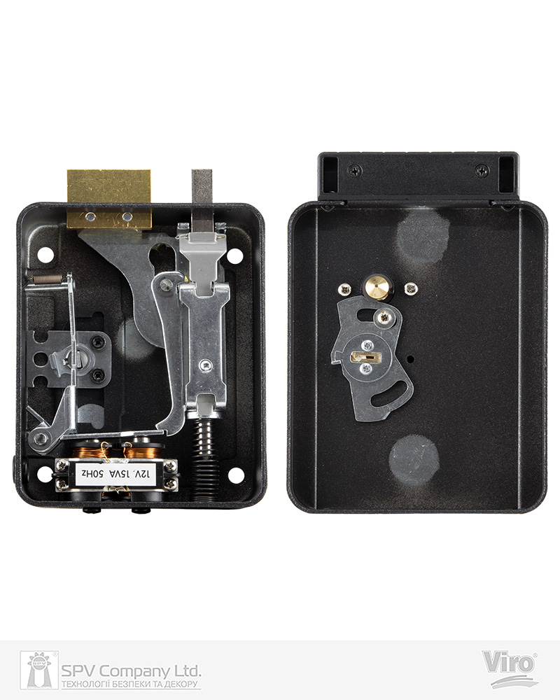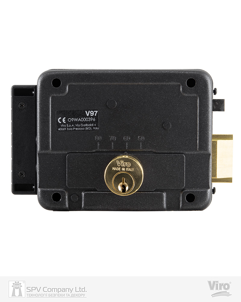 Електромеханічний накладний замок гаражного типу VIRO V97 моделі 8972.0794.2 керується електричним імпульсом змінного струму, з внутрішньою кнопкою виходу призначений для внутрішніх та зовнішніх дверей, вуличних брам, хвірток, захисних розпашних решіток, відкривання яких здійснюється до середини приміщення чи на сторону внутрішньої території об’єкту, як основний замок для розмежування контролю доступу.